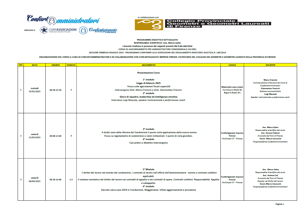 Organizzazione del corso a cura di Confartamministratori e in collaborazione con Confartigianato Imprese Firenze.  Patrocinio del collegio dei Geometri Laureati della Provincia di Firenze